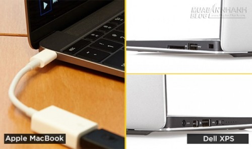 Apple trang bị cho dòng sản phẩm của mình chỉ 1 cổng kết nối USB-C duy nhất, đây chính là nhược điểm lớn nhất của thiết bị. Cổng này cho phép kết nối đa năng nhưng trong trường hợp cần kết nối nhiều thiết bị cùng 1 lúc, người dùng sẽ phải sử dụng đến bộ chuyển đổi ngoài. Ngược lại, XPS 13 cung cấp khả năng kết nối tuyệt vời với nhiều loại cổng kết nối, bao gồm 2 cổng USB 3.0, một đầu đọc thẻ SD và một bộ chuyển đổi Mini DisplayPort.