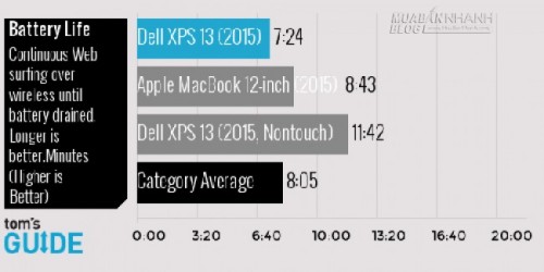 Nếu sử dụng chế độ cảm ứng thì thời lượng pin trên XPS 13 ngắn hơn so với MacBook 12-inch trên cùng một chương trình. Tuy nhiên, điều này lại hoàn toàn ngược lại nếu sử dụng Dell XPS 13 ở chế độ không cảm ứng, thời gian sử dụng của máy có khả năng lâu hơn tới 3 tiếng so với đối thủ Apple.