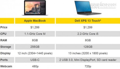 Với cùng mức giá khởi điểm 1.299 USD (tương đương 28,2 triệu đồng), Macbook 12 inch của Apple thực sự gây ấn tượng với màn hình Retina cực “chất” và bàn phím cùng touchpad hoàn toàn mới. Mặt khác, Dell XPS 13 cũng vô cùng nổi bật với màn hình 13 inch chất lượng quad HD, bộ xử lý CPU Core i5 mạnh mẽ.