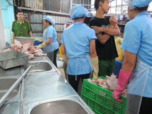 Khu vực đóng gói thành phẩm sơ sài, được đặt trên sàn nhà dơ bẩn, trơn trợt, đầy máu me. Tại khâu này, nhân viên đóng gói không ngừng nghỉ tay, bên dưới nhiều người liên tục dùng chổi đẩy nước dơ bẩn, hôi thối trên nền nhà xuống thẳng cống những khu vực xung quanh.