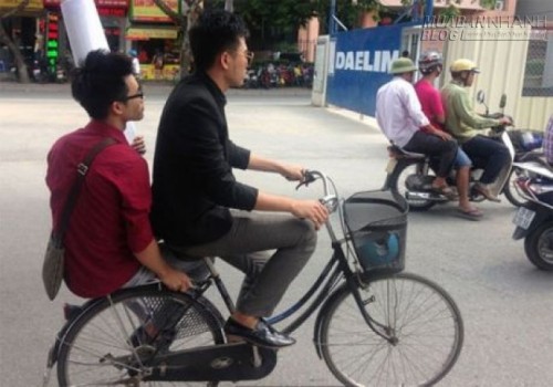 Hai nam sinh đi xe đạp, diện bóng bẩy cùng tấm biển đến các cổng trường trong ngày 20/8.