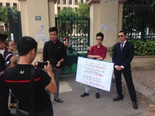 Chưa dừng lại tại đó, đến chiều cùng ngày, các nam thanh niên trên tiếp tục cầm biển đứng trước cổng trường ĐH Quốc gia Hà Nội (Xuân Thủy, Hà Nội) vào giờ đông sinh viên qua lại và liên tục chào mời.