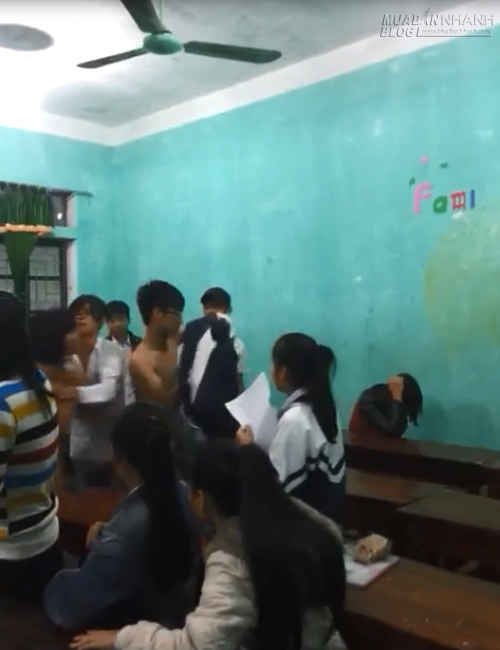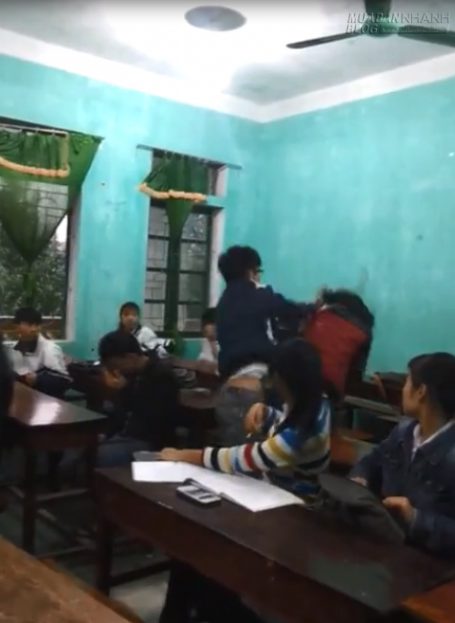 Lúc này có một nữ sinh khác vào can ngăn thì bị một nam sinh cùng lớp kéo ra ngoài. Nam sinh đeo kính cận tiếp tục cởi áo lao vào đánh đấm túi bụi nữ sinh nọ. Khi đó, nạn nhân tội nghiệp chỉ biết ngồi im chịu trận vì khi cô lên tiếng nói gì thì lại bị nam sinh kia lao vào đánh tới tấp.