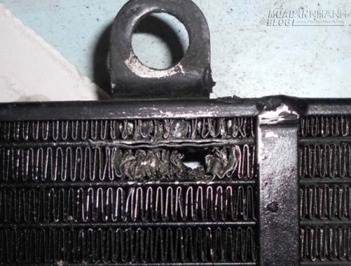 Két nước làm mát có thể bị thủng lỗ do nhiều nguyên nhân như va đập hoặc vướng vật cản không lưu thông được nước mát, dẫn đến nóng chảy. Lúc này chỉ còn cách dùng nước tự nhiên, có thể lấy ở sông suối gần đó hoặc nếu không sử dụng ngay chai nước uống mang theo, không sử dụng nước hóa chất như cocacola đổ lên két nước.