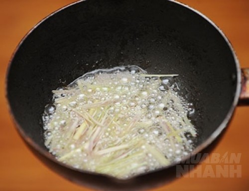 - Cho sả vào chảo vừa chiên sườn, để một lúc cho sả vàng thì vớt ra.