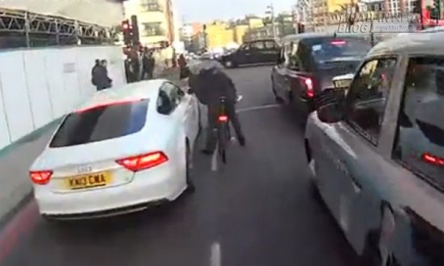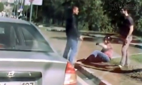 Tài xế chiếc hatchback tỏ ra liều lĩnh khi vọt lên rồi nhử phanh trước đầu chiếc SUV màu bạc. Hai xe bám sát nhau một đoạn trước khi xe SUV vòng lên chặn đầu đối thủ ở đèn đỏ. Tài xế xe SUV bước xuống, tung ngay một cú đá vào đối thủ trước khi lớn tiếng mắng mỏ.