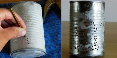 Bước 1: Bạn mang lon sắt đi rửa sạch và lau khô. Tưởng tượng ra hinh bạn muốn tạo trên hộp sắt, bạn có thể dùng bút vẽ lên rồi mới đục lỗ theo thì sẽ chuẩn hơn. Đặt đầu nhọn của đinh lên hộp sắt rồi dùng búa gõ nhẹ vào đầu đinh bên trên xuống tạo thành những chiếc lỗ trên hộp