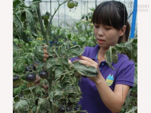 Chị Phạm Thị Xuân Thủy, chủ vườn cà chua đen ở thôn K’Long C, xã Hiệp An (Đức Trọng) cho biết, cách đây khoảng 1 năm, khi giá cà chua xuống thấp, khó tiêu thụ, gia đình chị nghĩ đến cách làm ăn mới, nhập hạt giống cà chua đen (7.000 đồng/hạt) về trồng thử. Vì giống lạ nên ban đầu chỉ dám trồng thử 200 cây, khi thấy hiệu quả mới mở rộng lên diện tích 1.000 m2 (tương đương 3.000 cây), trồng trong nhà kính để ngăn ngừa sâu bệnh.