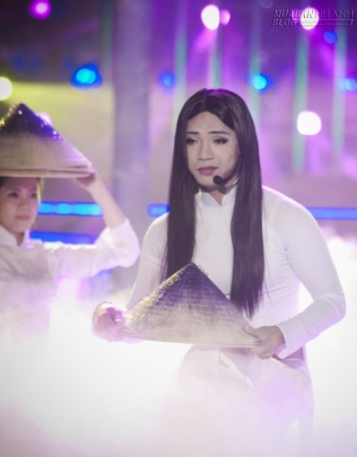 Mai Quốc Việt diện áo dài, yểu điệu hóa NSƯT Vân Khánh với ca khúc 'Huế thương'. Mái tóc dài cùng lớp trang điểm giúp chàng ca sĩ có vẻ ngoài mềm mại, nữ tính khác hẳn vẻ bụi bặm, mạnh mẽ trong các đêm thi trước. Anh chinh phục khán giả bằng giọng hát ngọt ngào, truyền cảm.
