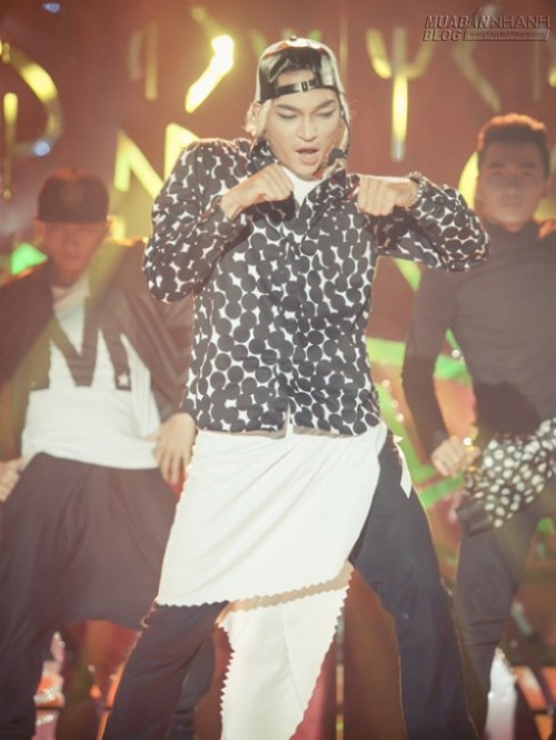Thanh Duy rất tự nhiên khi giả gái. Chàng ca sĩ tình tứ nắm tay 'đàn anh', hát bằng giọng nữ ngọt ngào.