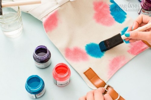 - Nhúng miếng mút vào màu sơn bạn thích, rồi chấm lên mặt ba lô ướt, để các mảng màu tự loang ra tự nhiên.