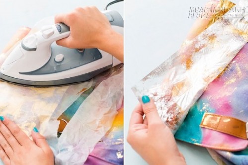 - Nếu muốn trang trí thêm nhũ trên ba lô, hãy úp tờ giấy nhũ kim lên mặt ba lô, lót thêm một tờ giấy nến rồi dùng bàn là là qua. Đợi miếng giấy nhũ kim nguội đi thì từ từ bóc ra để các mảng nhũ bám lại trên mặt ba lô.