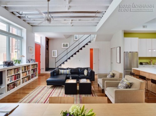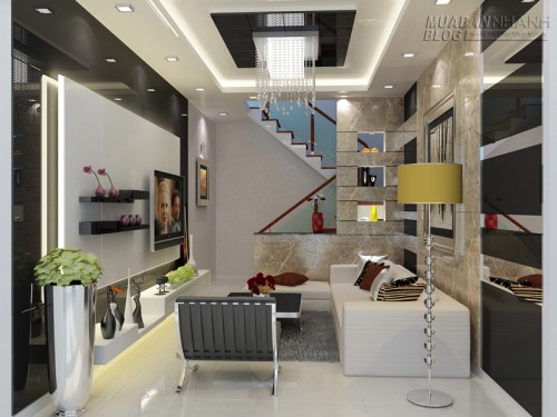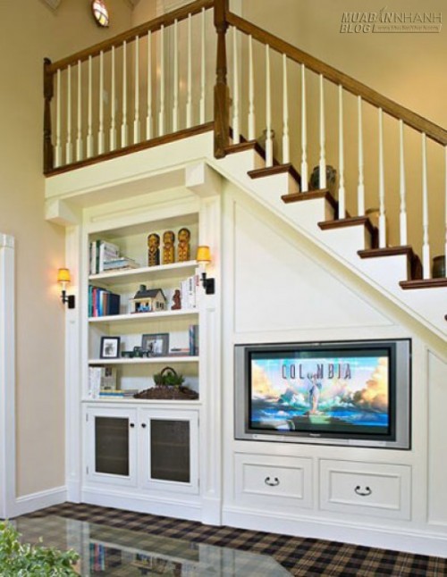 Với những phòng khách nhà ống thông thướng cầu thang đặt sắt bức tường ngăn giữa phòng khách và phòng bếp phía trong. Do đó thiết kế phòng khách cho kiểu nhà ống hệp này, bạn có thể tận dụng góc cầu thang để kệ ti vi hay giá sách hoặc một chiếc tủ đồ. Như thế vừa tận dụng được diện tích lài tạo nên sự hài hòa uyển chuyển trong căn phòng, giúp căn phòng trở nên ngăn nắp.