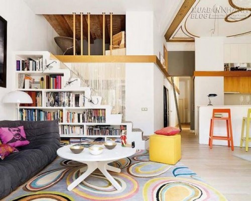 Thiết kế phòng khách chứa thêm cầu thang đòi hỏi việc bố trí sắp xếp nội thất trong phòng phải tinh tế hợp lý hơn. Với những chiếc cầu thang nhỏ bạn có thể đặt ở sát tường phía sau bộ ghế sofa để không làm cản trở lối đi lại và làm mất diện tích. Thiết kế trang trí nội thất trong phòng có điểm nhấn thu hút thị giác kết hợp với màu kệ cầu thang để tạo sự nổi bật cho phòng khách.