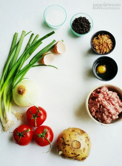 - 450g thịt lợn; 230g củ đậu, thái miếng dài nhỏ; 4 nhánh hành lá, xắt nhỏ; 1 quả trứng, đánh đều; 30g hành tây chiên; 30g bột bắp; 30ml dầu; 15g mioois; 2,5g tiêu