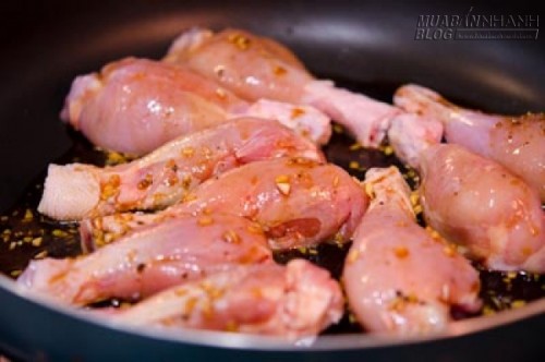 Bước 2: - Cho đùi gà vào chảo, không cần thêm dầu ăn. |