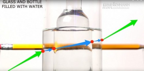 Mắt của chúng ta có thể thấy được sự khác biệt về tốc độ này một cách rõ nét, cũng như góc di chuyển của tia sáng. Chính vì vậy, bạn vẫn sẽ nhìn thấy chai ở bên trong lòng cốc nước. Ngoài ra, hình ảnh của bút chì đặt phía sau cũng sẽ bị mờ đi do sự khác biệt này.