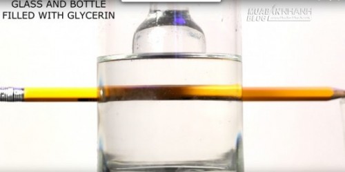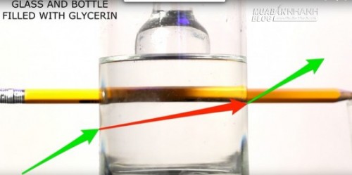 Tuy nhiên, khi đặt trong glycerin, chúng ta không thể thấy hình ảnh chai nước trong cốc, cũng như bóng bút chì đặt phía sau cốc cũng trở nên rõ nét hơn.