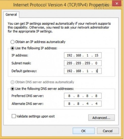 Lưu ý rằng nếu khi mở ra đã có thông số này thì bạn chọn lại IP động bằng dòng trên (Obtain an IP address automatically). Nếu không kết nối được nữa, bạn thay đổi số cuối cùng của IP Address.