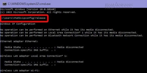 - Tiếp đó, khi giao diện DOS hiển thị, bạn gõ ipconfig/release xong Enter -> Tiếp tục gõ lệnh ipconfig/renew xong Enter. Lúc này, bạn thử kiểm tra lại xem hết “dấu chấm than” chưa nhé!