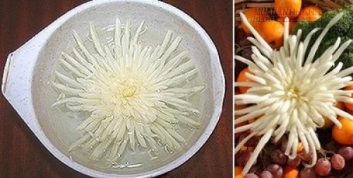 Sau khi tỉa xong bạn ngâm bông “hoa cúc” vào nước cho các cánh hoa mọng nước và comg mềm tự nhiên. Khi cần dùng bạn lấy hoa ra để ráo nước rồi trang trí món ăn.