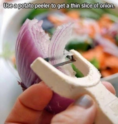 Dùng đồ gọt vỏ khoai tây để thái hành, tỏi sẽ giúp bạn tránh cay mắt. Ngoài ra, tay bạn sẽ tránh việc tiếp xúc với hành nên sẽ vệ sinh, sạch sẽ hơn. Bạn sẽ không phải bận tâm về chuyện khử mùi ở tay sau khi cắt nữa.