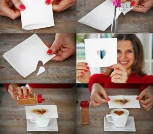 Dùng một mảnh giấy, cắt hình trái tim ở giữa, để lên mặt tách cà phê và rắc bột ca cao lên, vậy là bạn đã có một tách cà phê tuyệt đẹp và nghệ thuật với họa tiết trái tim bên trên, đâu nhất thiết phải biết vẽ. Áp dụng theo cách trên, bạn có thể "vẽ" được bất kì hình thù nào trên bề mặt tách.