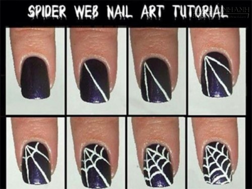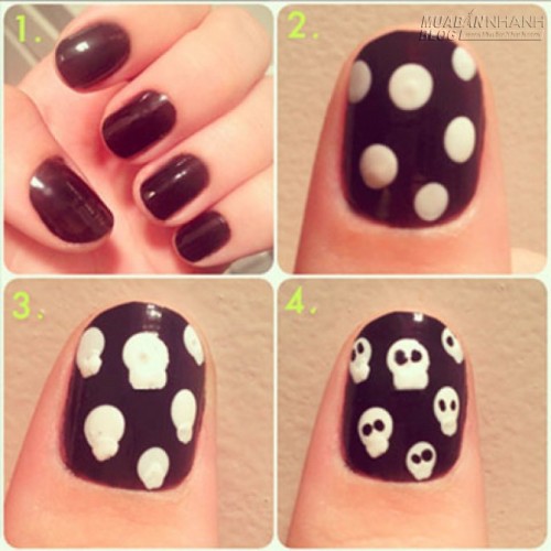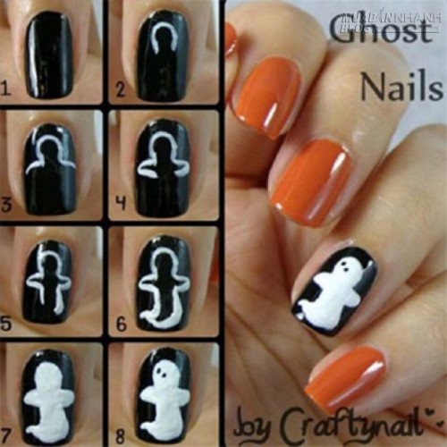 Dùng cọ hoặc cây tăm vẽ theo từng bước như hình bạn sẽ có được một con ma hoàn chỉnh, sau đó bạn có thể phối hợp với kiểu móng khác để thêm phần nổi bật nha