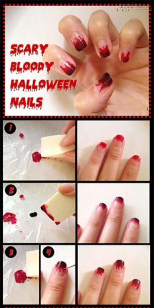 Mình thích kiểu này nhất, vừa dễ làm vừa ấn tượng. Chấm mực đỏ vào ngón tay và ấn lên trên móng đã sơn trắng, bảo đảm bạn sẽ có 1 kiểu móng không đụng hàng trong ngày halloween cho mà xem