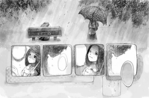 Vài ngày sau, Hân lại gặp chàng trai bên cửa sổ hôm nọ, bên cạnh cậu ta là chiếc ô Hân bỏ quên. Hân bước đến ngồi bên cạnh cậu ta “Cảm ơn cậu đã giữ ô hộ tôi nhé.”