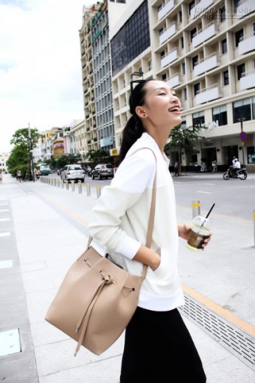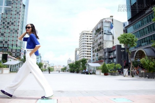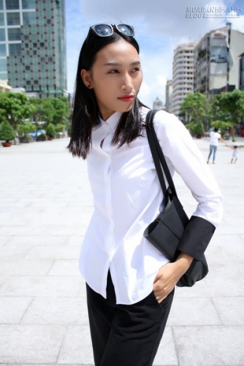 - Trang rất thích mặc những chiếc quần ống suông, rộng, cạp cao, chúng vừa dễ chịu lại giúp chân dài thêm dài. Đặc biệt là rất thanh lịch để tới công sở. Với kiểu quần này nhiều bạn sẽ chọn áo sơ mi bỏ trong quần rất chuẩn mực, nhưng bận áo lửng có tay lỡ và độ dài thân vừa phải như của Trang sẽ giúp bạn trẻ trung, mới mẻ hơn. Và tất nhiên bộ đồ sẽ rất hợp với đôi giày thể thao năng động.