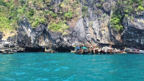 | Hang Morakot là điểm tham quan hút khách. Khi triều xuống thấp, du khách có thể bơi qua cửa hang tối đen để sang bãi biển bí mật ở phía bên kia. |