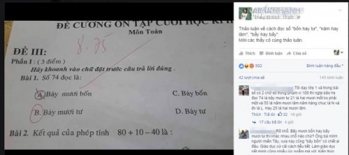 Bài toán lớp 1 thu hút hàng trăm lượt bình luận, hầu hết là các giáo viên trên diễn đàn. Cô giáo Nguyễn Thị Thu Hương khẳng định: “Tôi dạy lớp 1 và trong bài số có 2 chữ số trong phạm vi 100 thì người ta bảo học sinh đọc 74 là bảy mươi tư, 21 là hai mươi mốt, không phải một”.