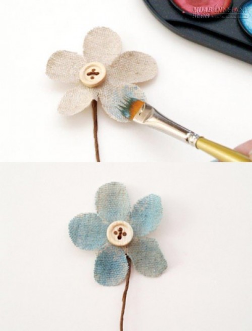 | Bước 1: - Trước tiên, bạn dùng cọ tô lớp màu trên các cánh hoa vải rồi để khô. |