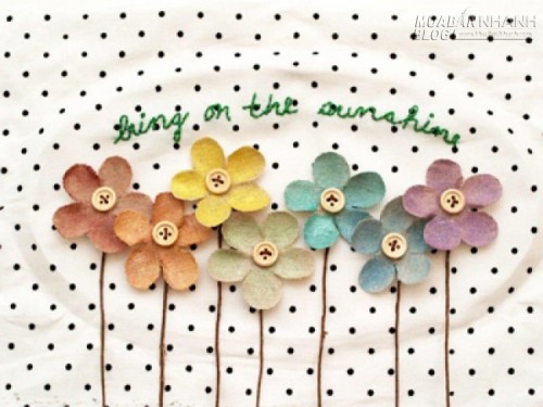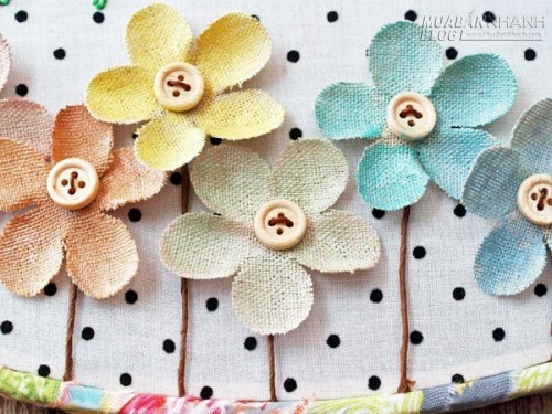| Bước 4: - Bạn tháo khung thêu ra, đặt các bông hoa xem kẽ nhau bên dưới dòng chữ. - Dùng keo dán cố định mặt sau bông hoa vào mặt tấm vải, bạn chú ý để phần dây bên dưới bông hoa song song với nhau nhé! |