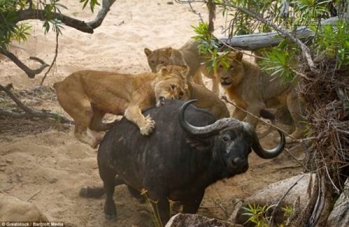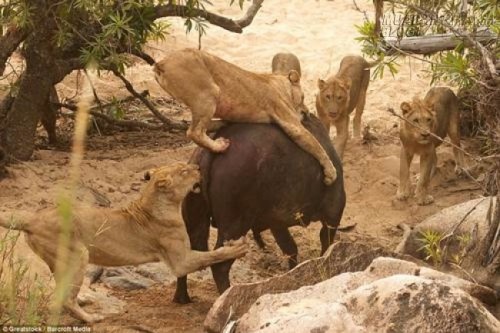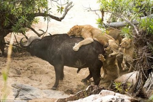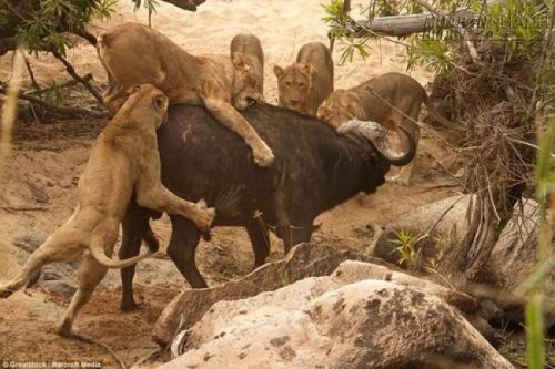 Năm con sư tử đã xác định mục tiêu trâu già chính là bữa ăn tối của chúng. Chắc chắn trâu sẽ có cái chết nhẹ nhàng hơn nếu đơn giản chấp nhận số phận của mình, đặc biệt là sau khi tách khỏi bầy đàn gồm 300 con trâu khỏe mạnh khác. Tuy nhiên, sư tử dũng mãnh ấy vẫn không thể hạ gục được một con trâu già khi nó nhanh chóng bơi xuống sông trốn thoát.