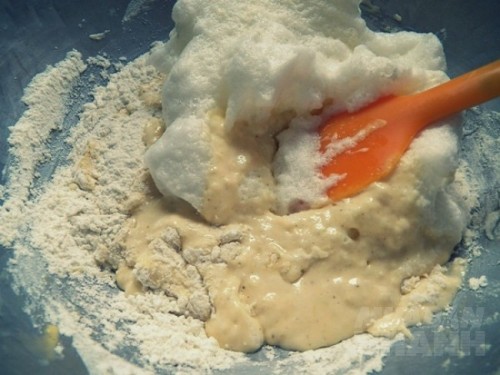 - Thêm 1 lòng trắng trứng vào bát rồi đánh đều đến khi sủi bọt trắng.