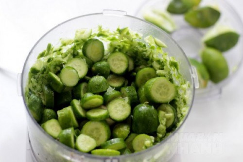 - Dùng dao thái lát dưa thành các miếng nhỏ và cho tất cả vào máy xay sinh tố nghiền nhuyễn khoảng 1 phút.