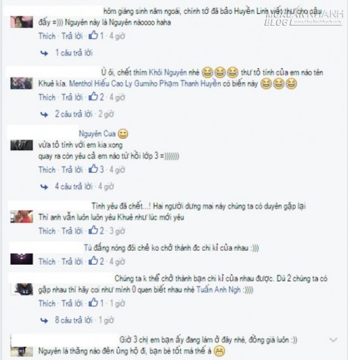 Và đông đảo nhất là “lực lượng quần chúng” chuyên tag tên bạn bè mình vào bình luận, kèm theo những kỷ niệm vui nhộn về thời học sinh tán nhau qua thư. Trong câu chuyện này thì tất nhiên “khổ chủ” là các đối tượng tên Khuê và Nguyên!