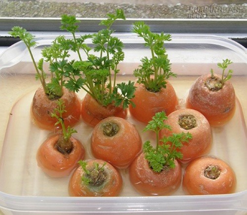 Khi gọt cà rốt, bạn thường cắt bỏ đầu. Thực tế đầu củ cà rốt phát triển rất nhanh nếu được đặt trong một cái hộp có ít nước và hấp thụ ánh sáng nhẹ nhàng. Bạn không chỉ có một bình trang trí thú vị mà còn có thể lấy các ngọn xanh dùng như rau mùi bỏ vào món súp, cho vào nước ép hoa quả. Sau 3 tháng trồng sẽ cho củ.