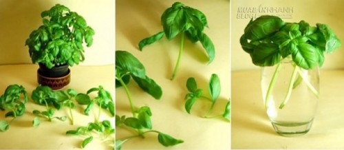 Giâm vài cọng húng quế dài độ 10 cm vào một cốc nước và đặt nó ở nơi có ánh sáng mặt trời trực tiếp. Khi rễ dài khoảng 5 cm, bạn có thể trồng chúng trong chậu. Thay nước thường xuyên và đặt nơi ánh sáng trực tiếp, ít nhất được 6 tiếng mỗi ngày.