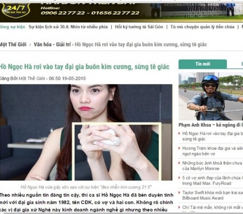 Sau khi "rời xa" Cường Đô la, Hồ Ngọc Hà mới đây bị "tố" cặp kè với đại gia buồn kim cương, sừng tê giác. Không rõ chính xác vị đại gia xứ Nghệ này kinh doanh ngành nghề gì nhưng CĐK có thời gian dài sống ở Nam Phi, chuyên kinh doanh sừng tê giác, ngà voi và kim cương.