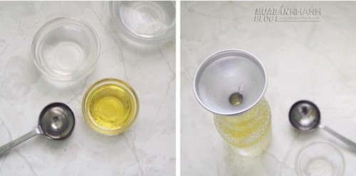 Bước 2: Sau khi đun dầu dừa nóng, đổ dầu vào lọ qua phễu.