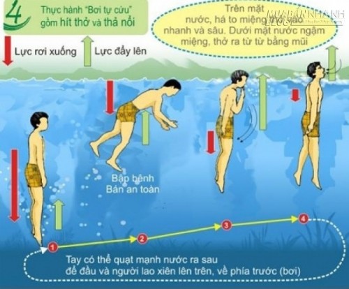– Tiếp tục thả lỏng người để nước đẩy lên sát mặt nước trở về tư thế bập bênh bán an toàn, đầu nổi sát mặt nước, chân ở phía nước sâu.