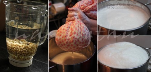Cho đậu và nước vào máy xay sinh tố xay thật kĩ. Với 500g đậu khô, sau khi ngâm mình xay 3 mẻ là hết.