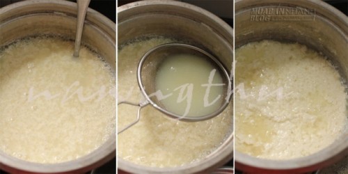 Đặt một cái rây lên mặt để phần nước trong lọt vào trong lòng chiếc rây này, dùng thìa múc nước trong này ra. Nước múc ra lúc này đã là nước chua, có thể để dành cho lần làm sau sẽ dùng nước này tạo đông kết thay cho dấm. Nhưng nếu bạn không làm thường xuyên thì không nên giữ lại mà hãy đổ bỏ cho đỡ tốn chỗ trong tủ lạnh. Sau khi gạn phần nước trong đi, óc đậu lúc này còn rất đặc.