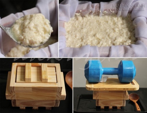 Trải khăn vào khuôn, xúc đậu vào, gập các mép khăn lại cho gọn gàng, đậy nắp và đặt một vật nặng lên trên. Nén đậu khoảng 15-20 phút là được.