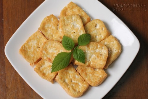 Với 500g đậu nành, mình làm 1 mẻ đậu là đủ một bữa ăn cho gia đình (sau khi bớt ra 2 cốc sữa đậu nành để uống) Đĩa đậu rán này là từ mẻ đậu trên (sau khi ăn vụng mấy miếng đậu sống lúc mới dỡ khuôn)