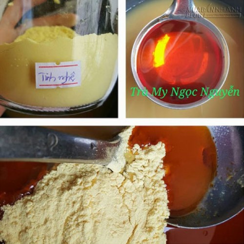 - Lọc bỏ tất cả bã, giữ lại phần nước trong, lúc này, nếu bạn nào dùng nghệ tươi thì đã có thành phẩm nước nghệ, còn sợ vàng tay, chọn tinh nghệ thì các bạn cho 20gram tinh nghệ vào bát nước rồi khuấy cho bột nghệ tan thật đều.
