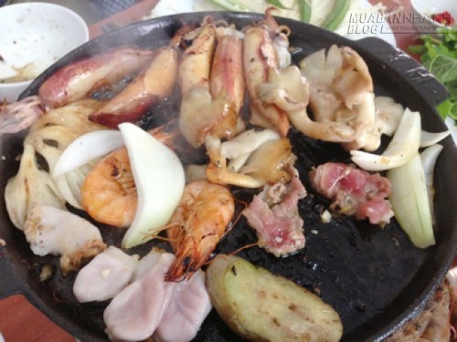 Bước 7: Đặt chảo gang lên bếp cồn đun thật nóng, cho vào một thìa dầu ăn, một muỗng bơ nhỏ đun cho nóng chảy. Lần lượt cho các nguyên liệu vào phủ kín mặt chảo để nướng.